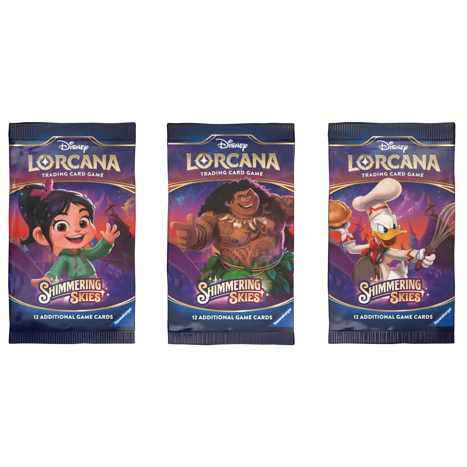 One display contains 24 booster packs. Booster packs contain 12 random cards out of the card set. These booster packs come in three different designs, but unlike with other SKUs, players are not guaranteed to