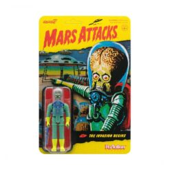 #1 THE INVASION BEGINS: With technology nearly beyond comprehension, the Martians in the Mars Attacks trading card series descended on humanity with brutal results. The 3.75″ articulated Mars Aliens figure comes complete with a deadly ray gun, and is that a smile on his face? Based on card #1 “The Invasion Begins” this Mars Attacks ReAction Figure is a must-have addition to your collection!