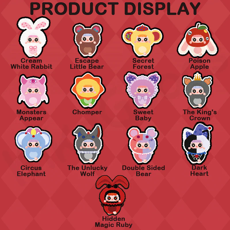 Serien tilbyr 12 vanlige design + 1 skjult design. Figurene er laget av ABS og 100 % polyesterfiber og måler rundt 5,1 tommer i høyde. Hver boks leveres med metallnøkkelring og gir flere muligheter for dekor og bærbar bruk.